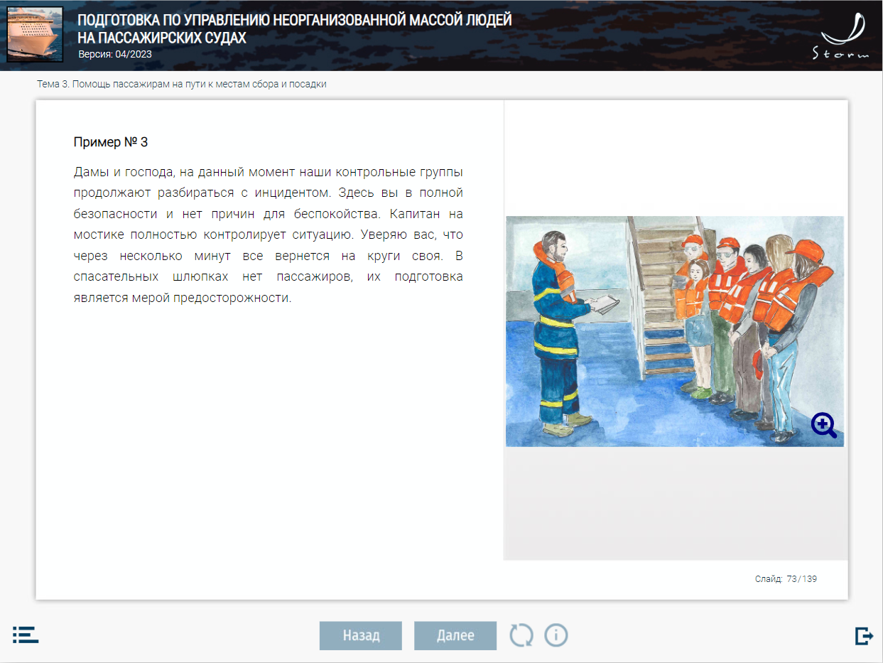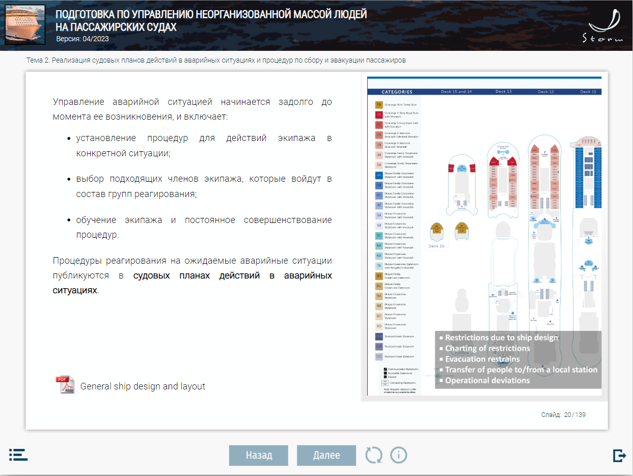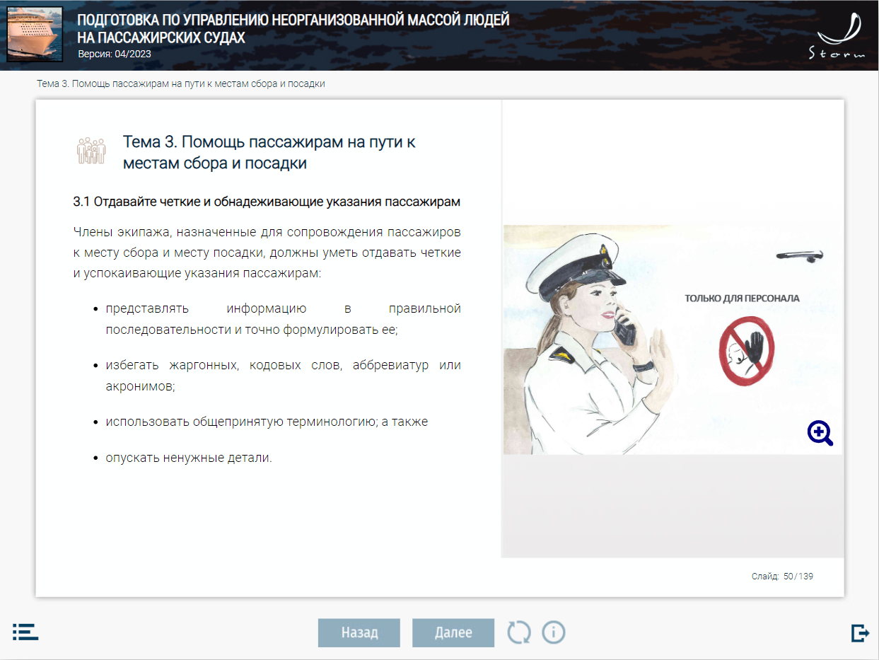 Мультимедийный обучающий модуль предназначен для предоставления слушателям знаний в соответствии с обязательными минимальными требованиями к подготовке по управлению неорганизованной массой людей на пассажирских судах в соответствии с пунктом 3 раздела A-V/2 Конвенции ПДНВ (пункт 7 Правила V/2 Конвенции ПДНВ).