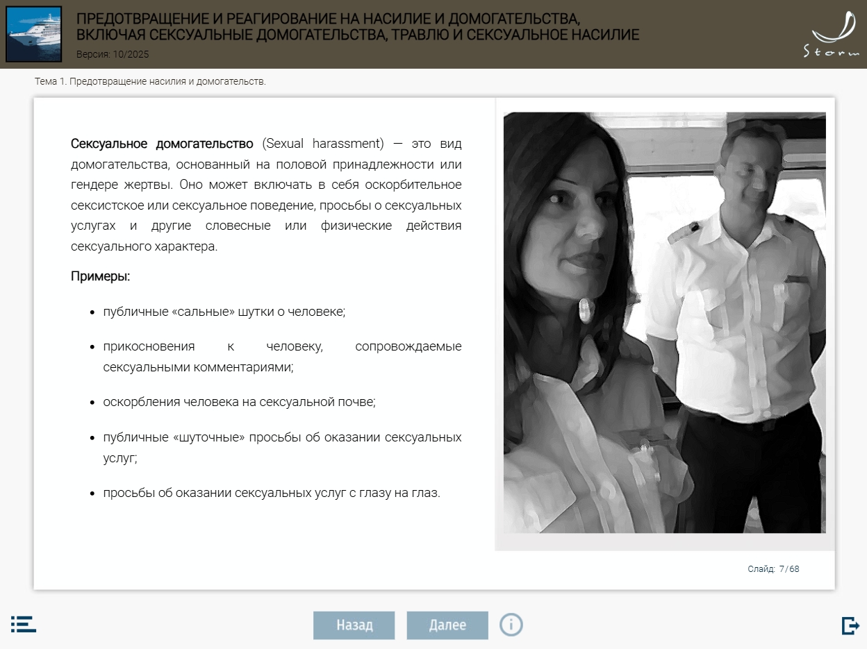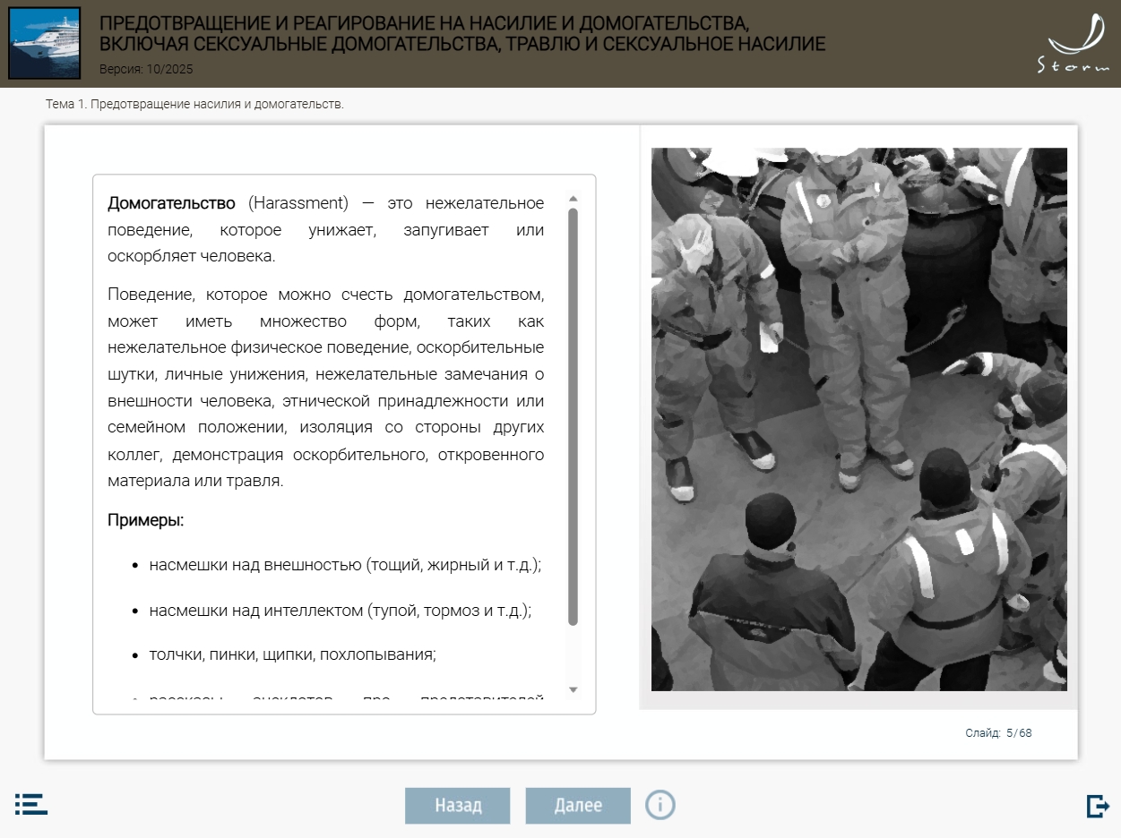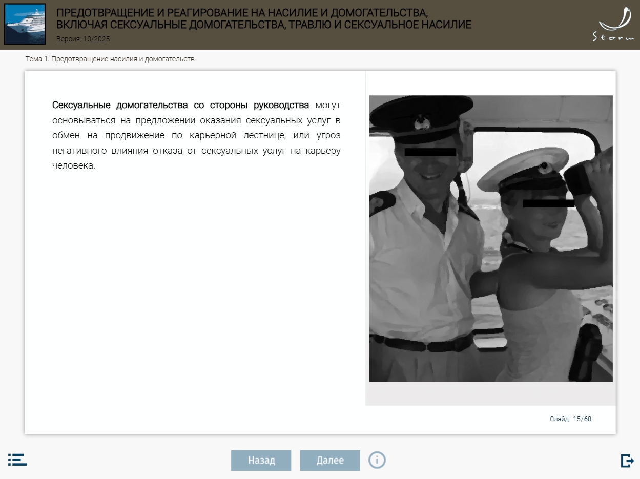 Мультимедийный обучающий модуль предназначен для теоретического обучения моряков в соответствии с требованиями раздела A-VI/1-4 в части, касающейся мер направленных на предотвращение и пресечение насилия и притеснений в морском секторе, включая сексуальные домогательства, издевательства и сексуальное насилие.