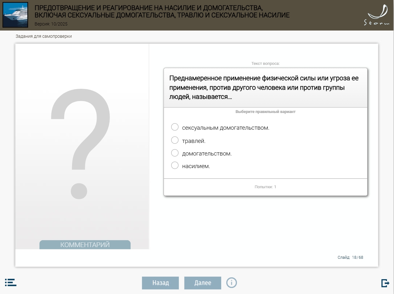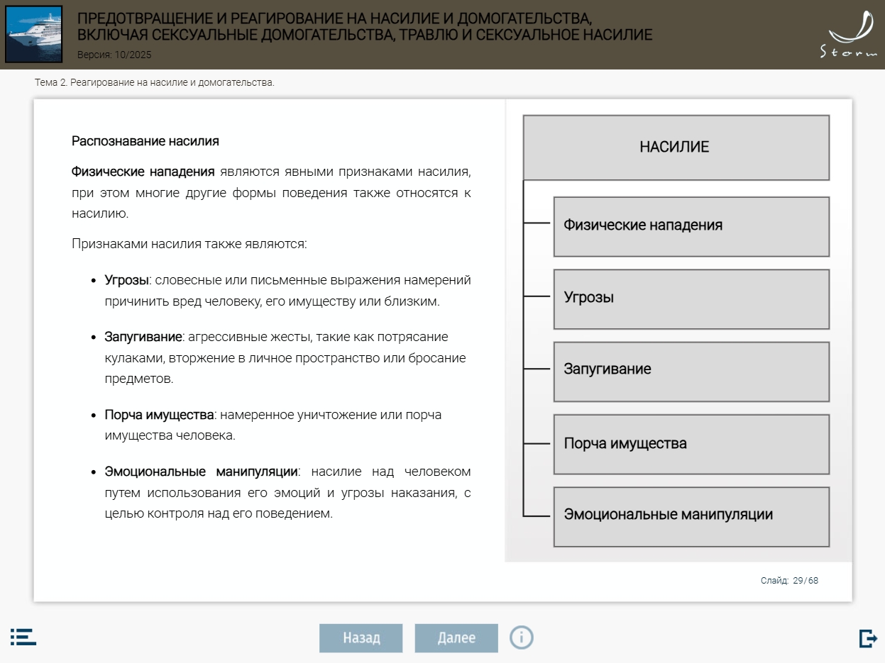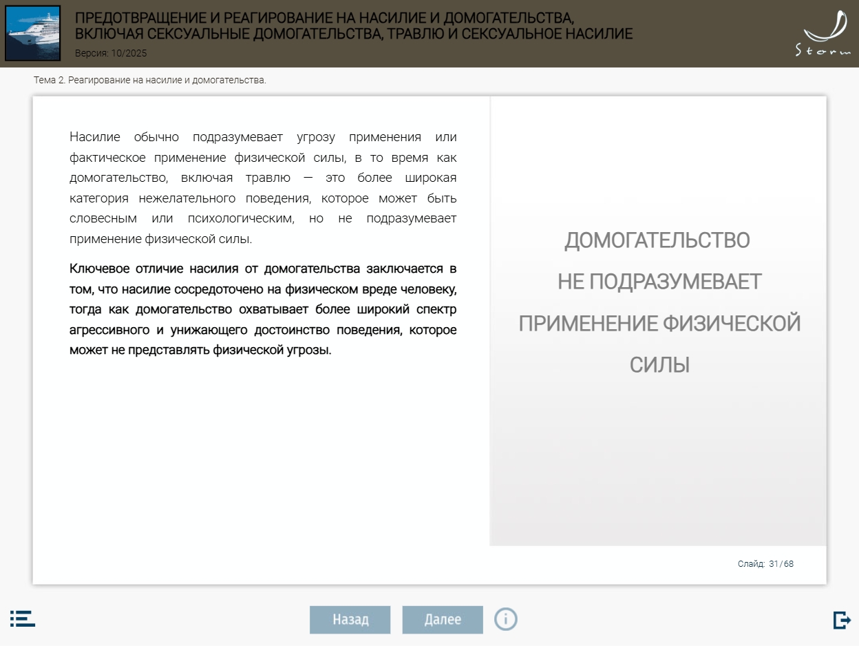 Мультимедийный обучающий модуль предназначен для теоретического обучения моряков в соответствии с требованиями раздела A-VI/1-4 в части, касающейся мер направленных на предотвращение и пресечение насилия и притеснений в морском секторе, включая сексуальные домогательства, издевательства и сексуальное насилие.