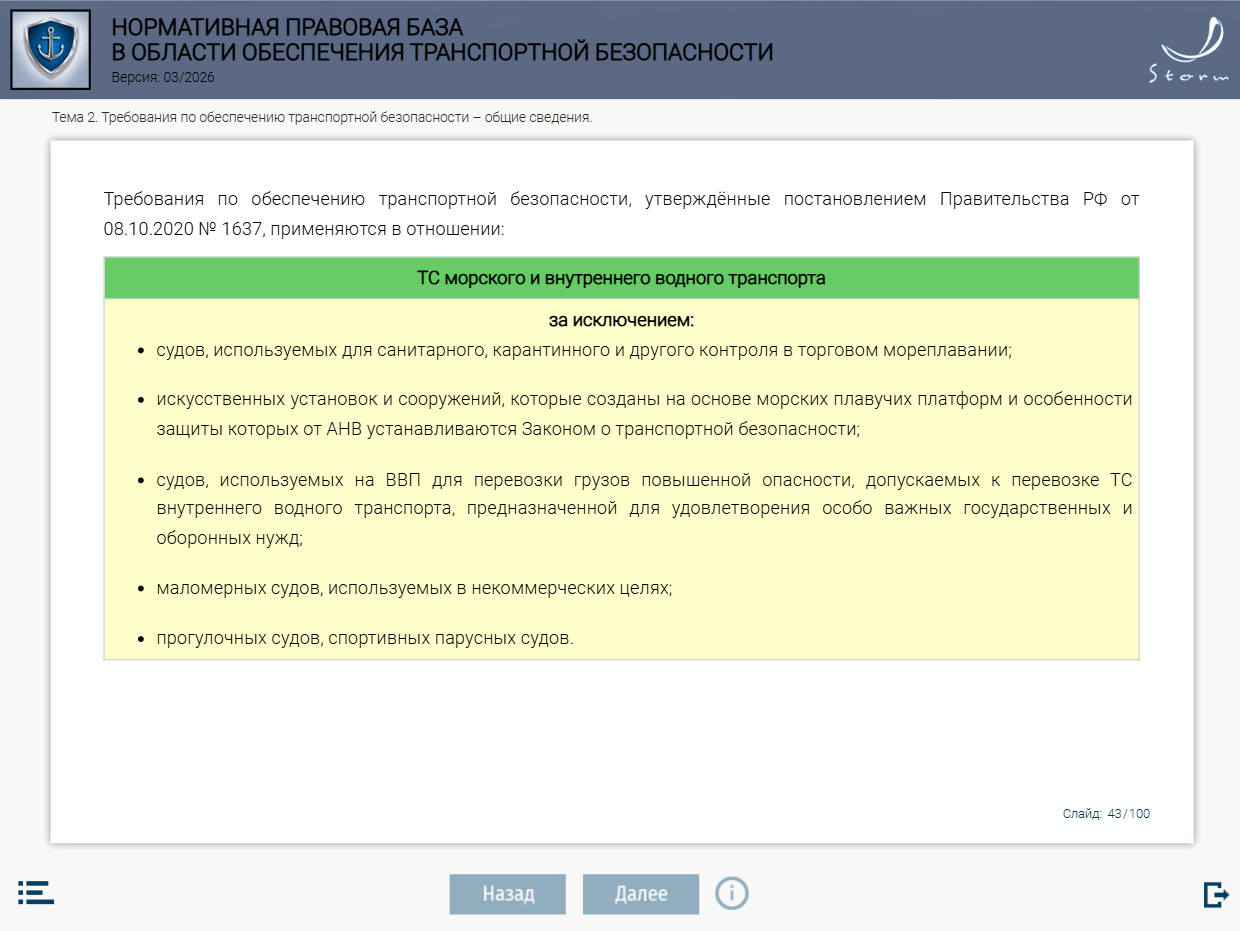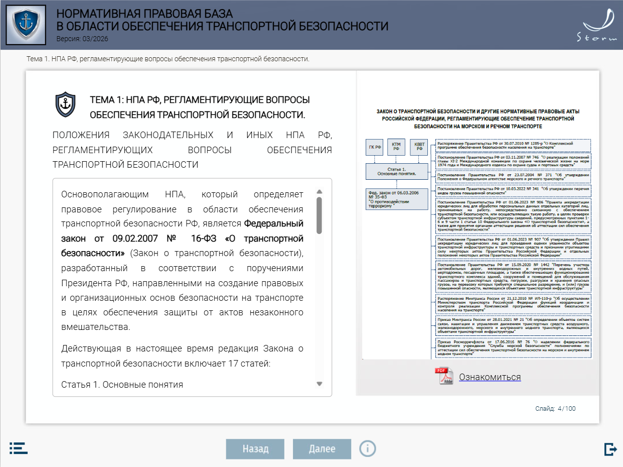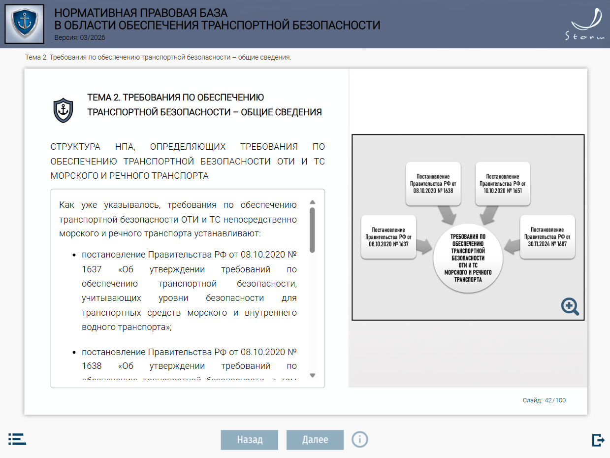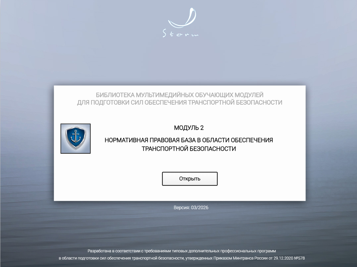 Мультимедийный обучающий модуль предназначен для теоретической подготовки работников сил обеспечения транспортной безопасности в соответствии с приказом Минтранса России от 29.12.2020 № 578 «Об утверждении типовых дополнительных профессиональных программ в области подготовки сил обеспечения транспортной безопасности».