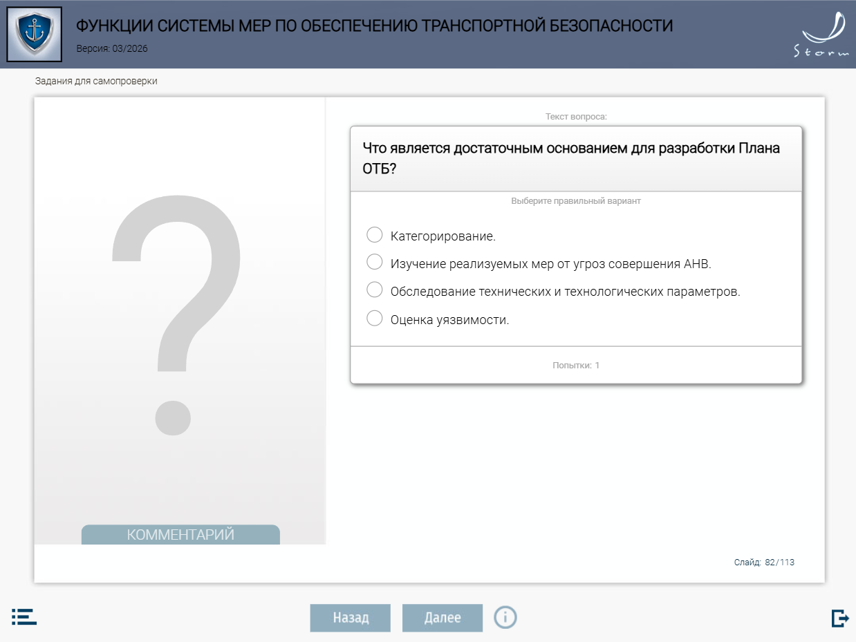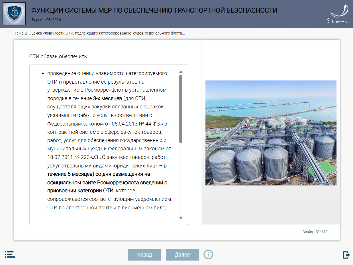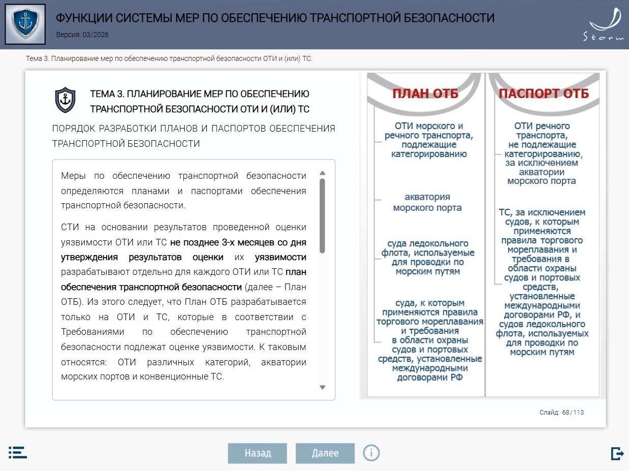 Мультимедийный обучающий модуль предназначен для теоретической подготовки работников сил обеспечения транспортной безопасности в соответствии с приказом Минтранса России от 29.12.2020 № 578 «Об утверждении типовых дополнительных профессиональных программ в области подготовки сил обеспечения транспортной безопасности».