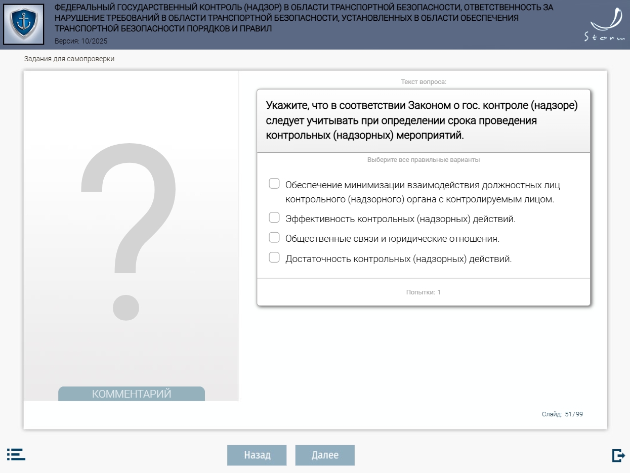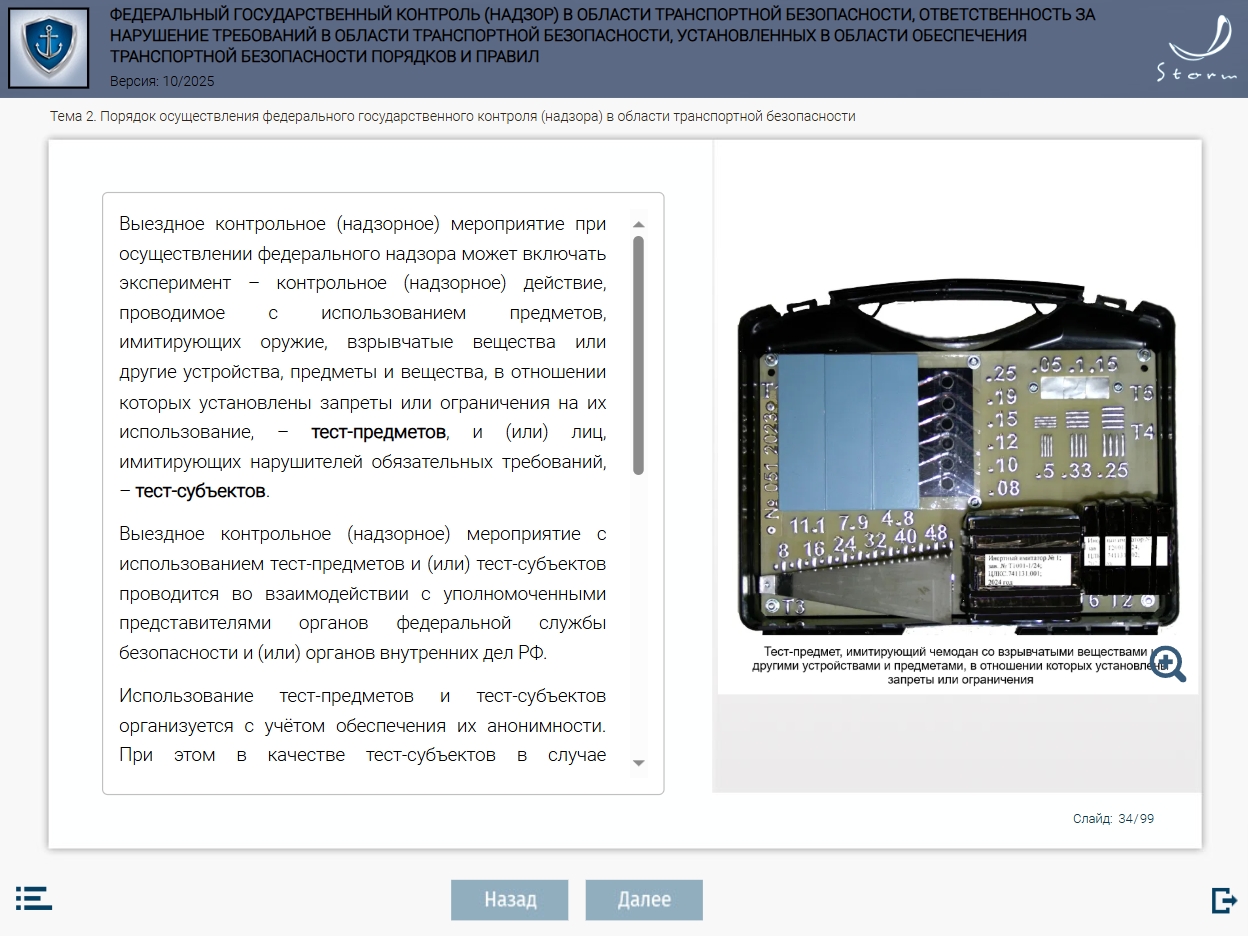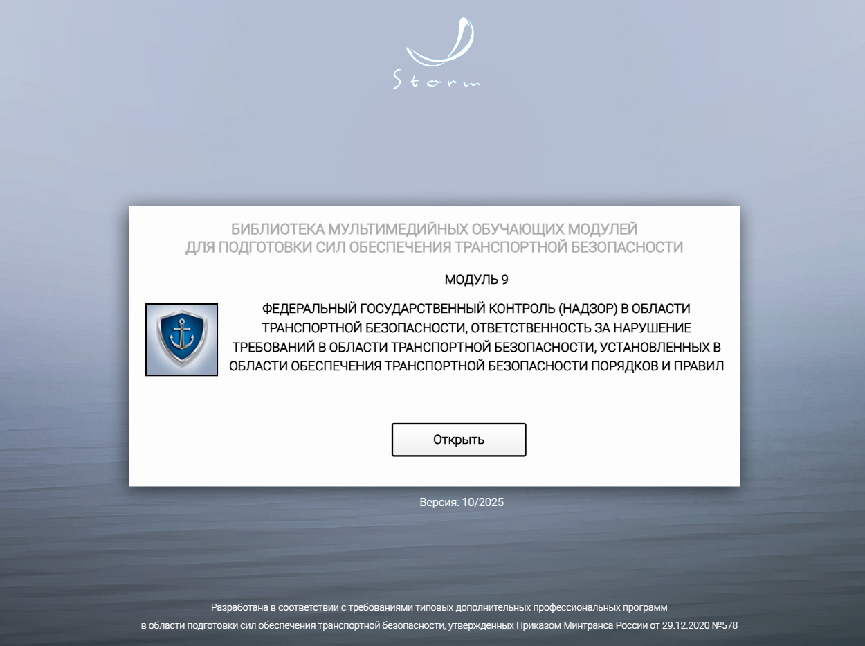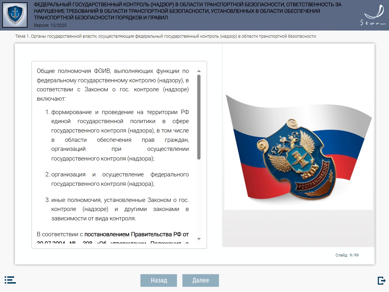Мультимедийный обучающий модуль «Федеральный государственный контроль (надзор) в области транспортной безопасности, ответственность за нарушение требований в области транспортной безопасности, установленных в области обеспечения транспортной безопасности порядков и правил» предназначен для теоретической подготовки работников сил обеспечения транспортной безопасности в соответствии с приказом Минтранса России от 29.12.2020 № 578 «Об утверждении типовых дополнительных профессиональных программ в области подготовки сил обеспечения транспортной безопасности».
