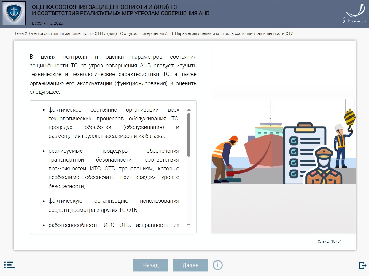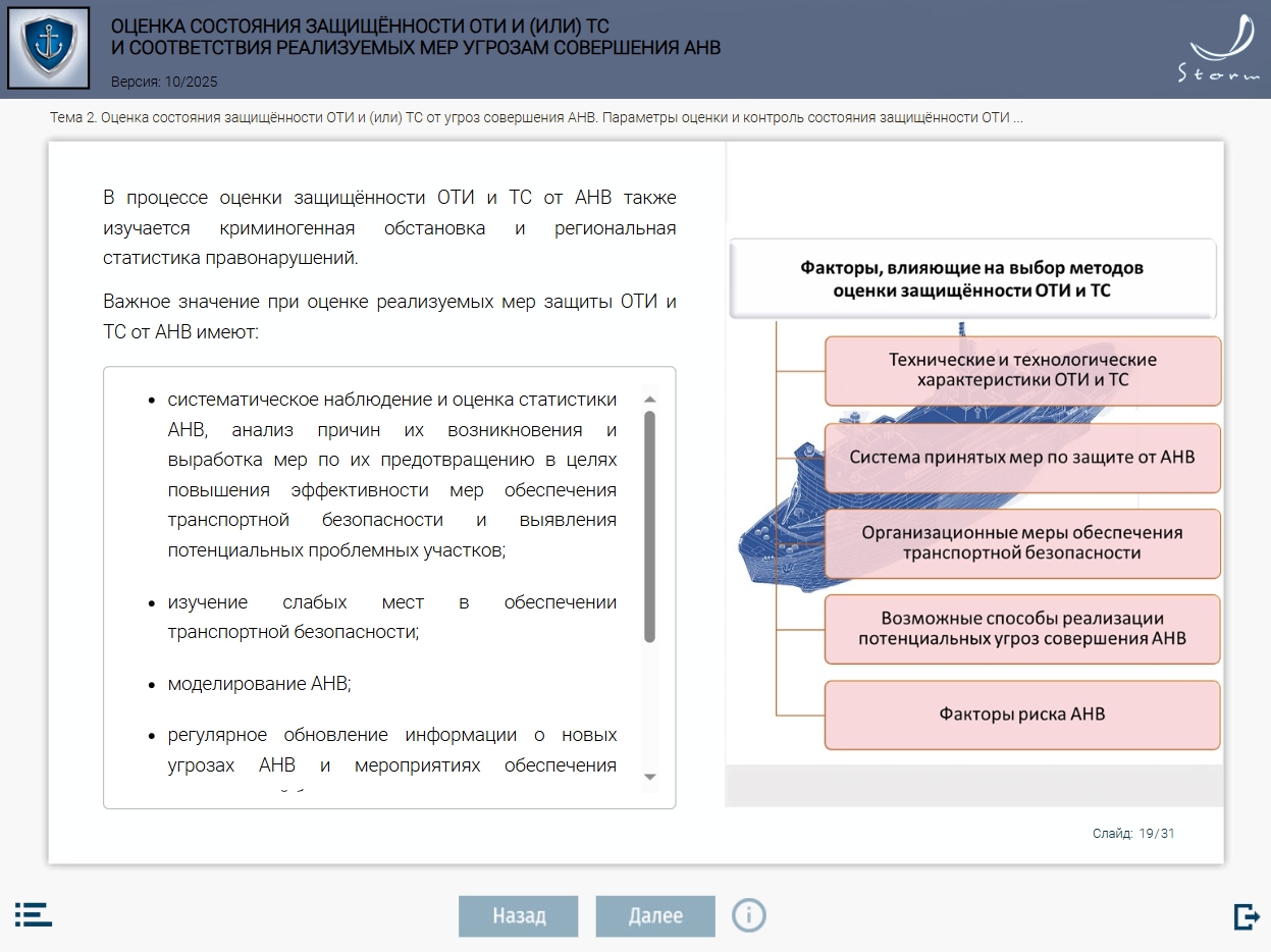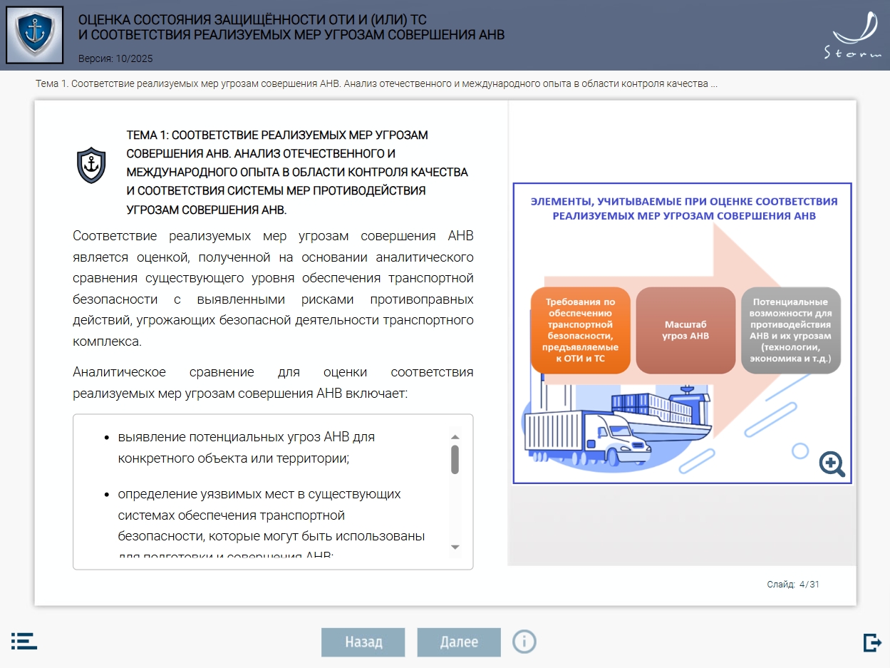 Мультимедийный обучающий модуль предназначен для теоретической подготовки работников сил обеспечения транспортной безопасности в соответствии с приказом Минтранса России от 29.12.2020 № 578 «Об утверждении типовых дополнительных профессиональных программ в области подготовки сил обеспечения транспортной безопасности».