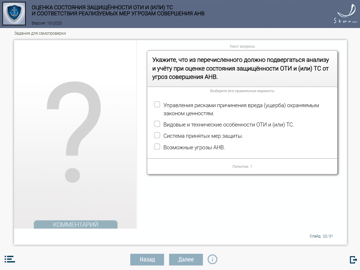 - Оценка состояния защищённости ОТИ и (или) ТС от угроз совершения АНВ. Параметры оценки и контроль состояния защищённости ОТИ и (или) ТС от угроз совершения АНВ.