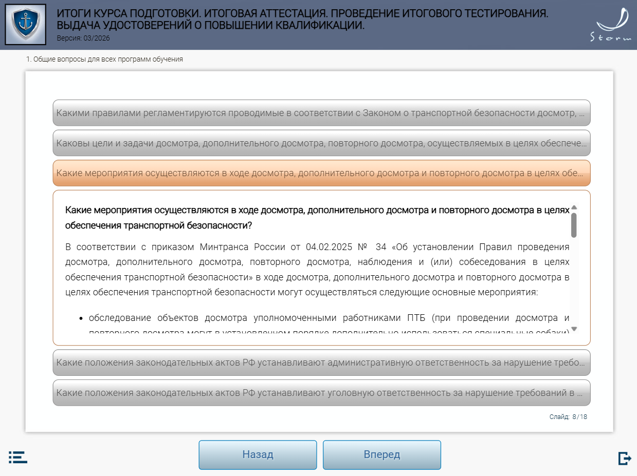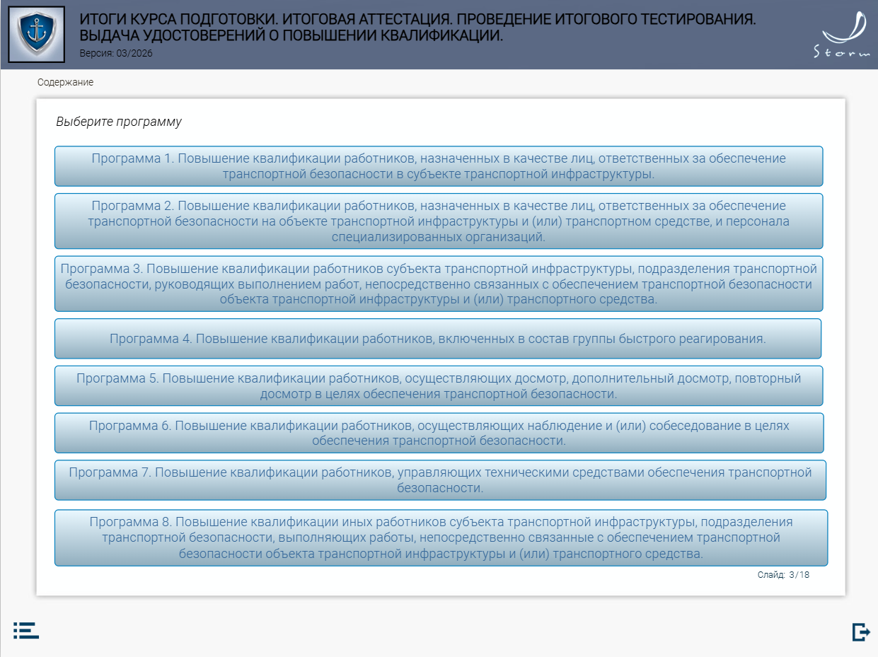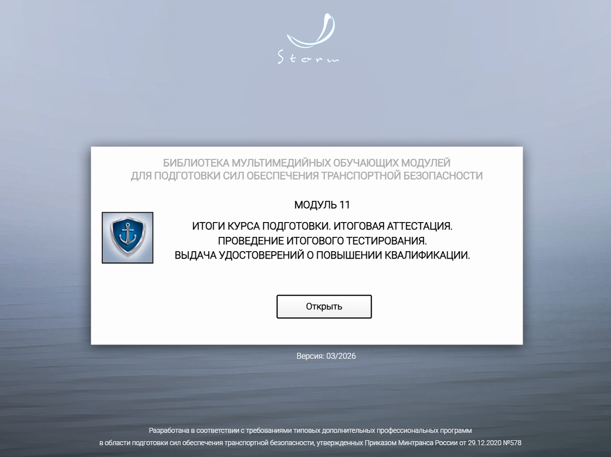 Мультимедийный обучающий модуль предназначен для теоретической подготовки работников сил обеспечения транспортной безопасности к аттестации в органах аттестации в соответствии с приказом Минтранса России от 29.12.2020 № 578 «Об утверждении типовых дополнительных профессиональных программ в области подготовки сил обеспечения транспортной безопасности».