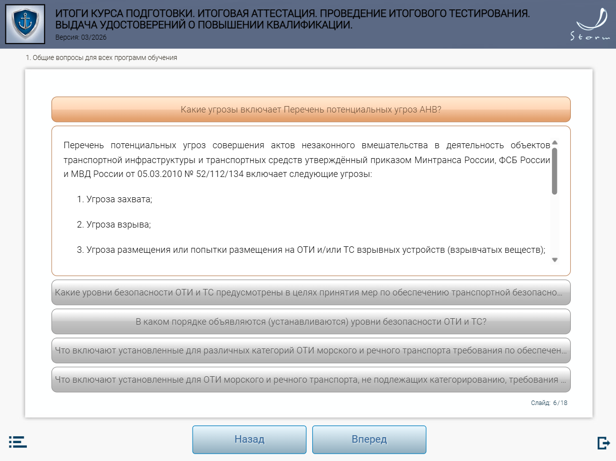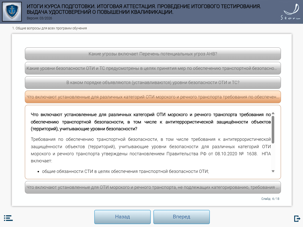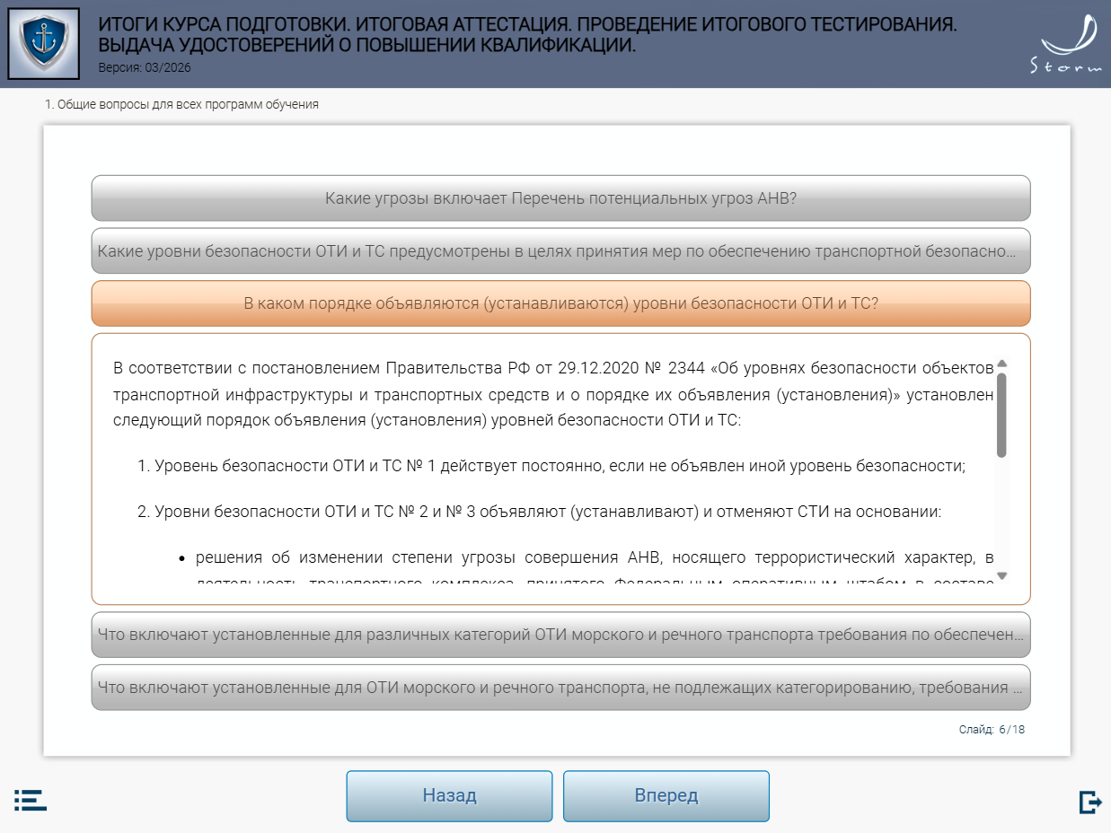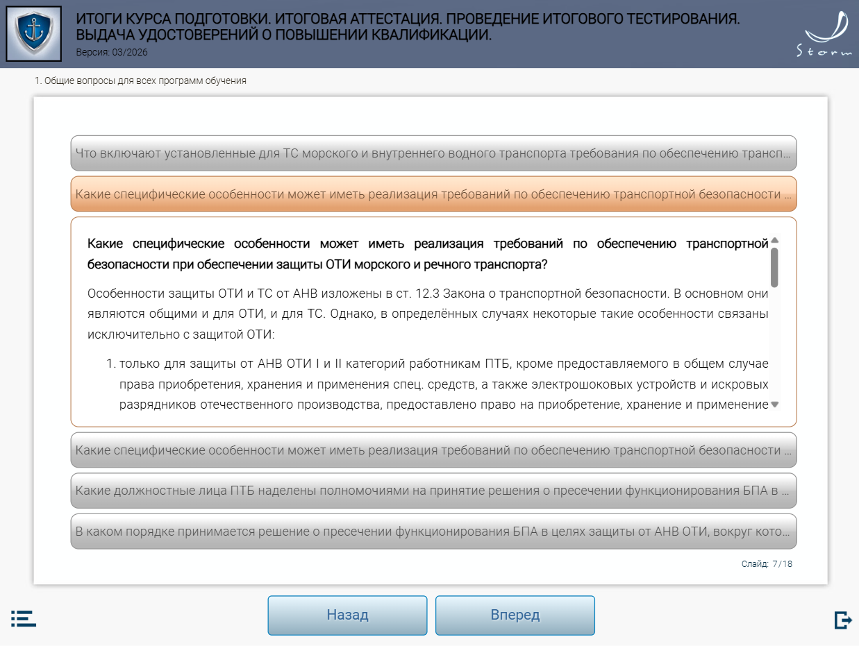 Мультимедийный обучающий модуль предназначен для теоретической подготовки работников сил обеспечения транспортной безопасности к аттестации в органах аттестации в соответствии с приказом Минтранса России от 29.12.2020 № 578 «Об утверждении типовых дополнительных профессиональных программ в области подготовки сил обеспечения транспортной безопасности».